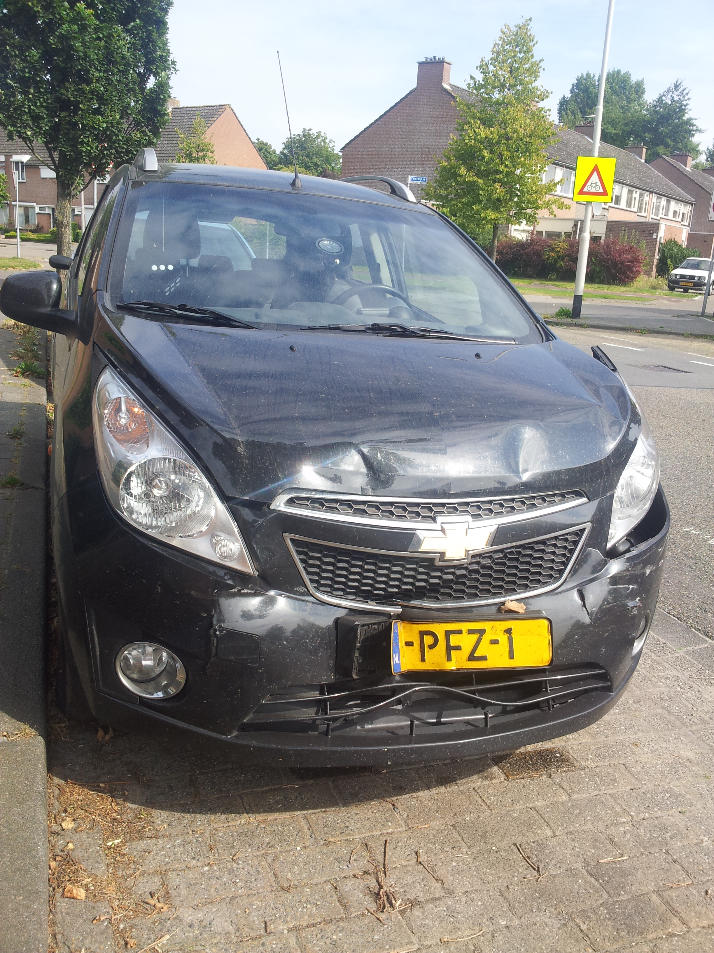 Maar goed, ik had het over auto problemen. Toen ik nog niet zo heel lang mijn gloednieuwe Chevrolet Spark had reed ik net als alle andere dagen naar het werk. En op het laatste gedeelte van de route was ik heel even afgeleid door wat werkzaamheden in het weiland links van me. Iets met het aanleggen van nieuwe riolering dacht ik. En voordat ik het doorhad stond er ineens een auto stil voor me. Deze wilde wilde afslaan naar een weg aan de rechterkant (die ik overigens nog nooit had gezien) en BOEM zo knalde ik ineens met *ik denk toch wel zo’n 60 kilometer per uur* bovenop een auto (met trekhaak) Volgens mij heb ik nog geprobeerd om de auto te starten om van de weg af te rijden. Maar dat ging niet meer gebeuren. De auto was eigenlijk meteen total loss. Tenminste, dat hoorde ik achteraf.